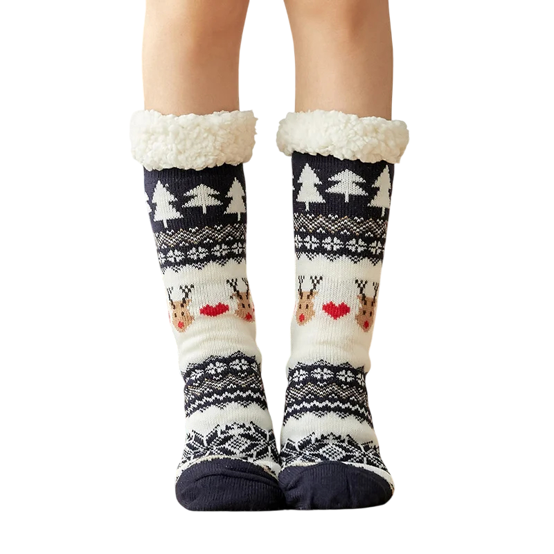 Värmande vinterstrumpor med romantiskt julmotiv av älgar erbjuder mjukhet, värme och komfort. Lämpliga för avkoppling hemma eller som en trevlig säsongsbetonad present. Fullständig beskrivning