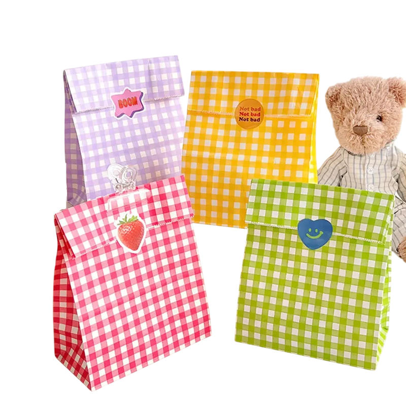 Varje påse har en distinkt rutigt design i olika färger, vilket ger en elegant, lekfull och festlig känsla. De passar både barn och vuxna och kompletterar dekoren för vilken händelse som helst. Kvalitetspappret säkerställer att påsarna behåller sin form och är lätta att vika och stänga. Deras naturliga bas i kombination med den färgglada tryckningen skapar ett modernt, samtidigt ekologiskt utseende som passar för olika tillfällen.