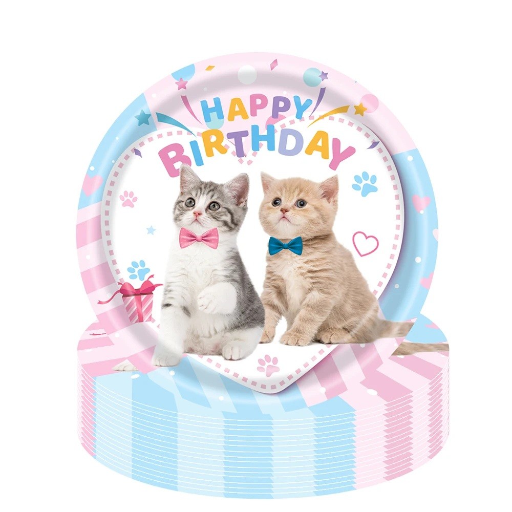 Papperstallrikar med kattmotiv och texten Happy Birthday är en utmärkt del av födelsedagsdekorationen.