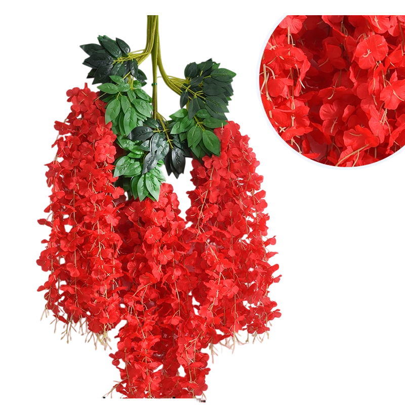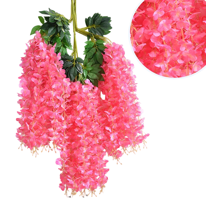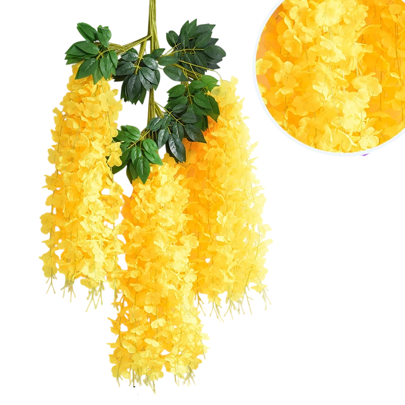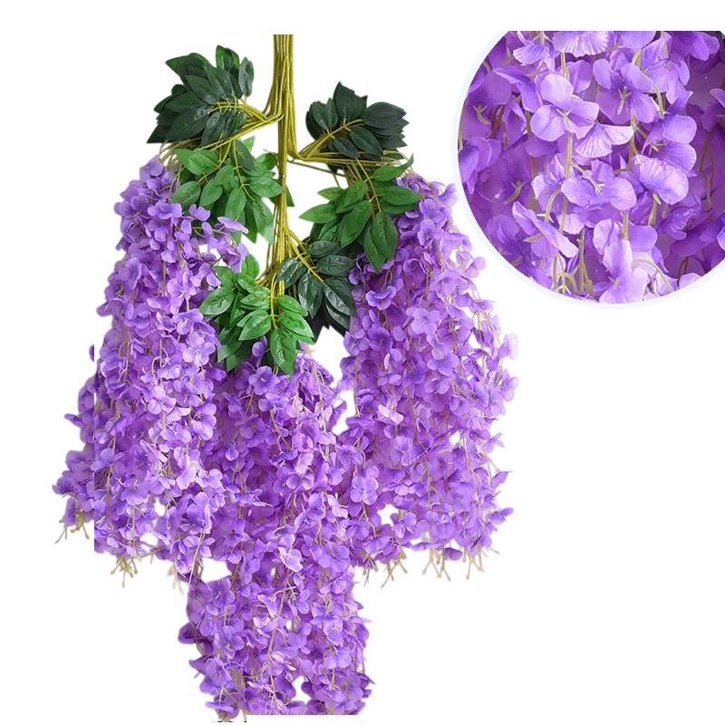 Wisteria är känd för sina långa hängande blommor som skapar eleganta blomsterhäng. Hängande künstlig blomma wisteria är därför en populär dekoration vid bröllopsceremonier, dekoration av festlokaler, fotohörnor eller trädgårdsfester. Tack vare den långa konstruktionen kan blommorna enkelt hängas på väggar, pergolor, festbågar eller dekorativa konstruktioner.