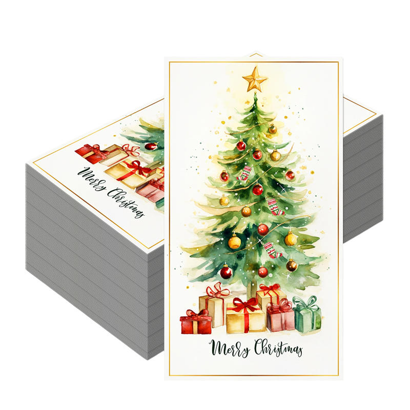 Julservetter med motiv av en dekorerad gran och presenter under den kompletterar vackert festbordet och skapar en trevlig atmosfär under julen. Fullständig beskrivning