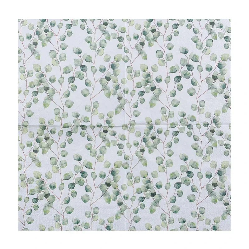 Papperservetter med motiv av små blad är ett utmärkt komplement för alla som vill skapa en harmonisk och naturlig atmosfär vid dukningen. Tack vare den mångsidiga designen passar de i hem, restauranger och kaféer. Dubbellagerkonstruktionen säkerställer pålitlig användning under måltider och bevarar samtidigt ett elegant utseende. Servetterna kan fungera både som en praktisk hjälp och som ett dekorativt inslag i bordets utsmyckning. Skapa en trevlig dukning inspirerad av naturens skönhet.