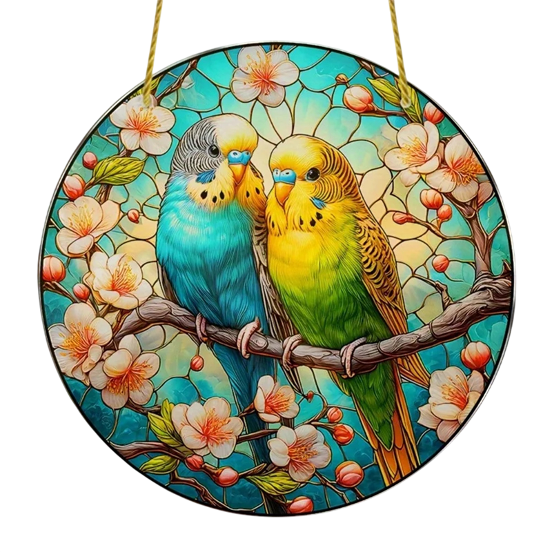 Startsida Startsida Hus och hushållsartiklar Dekorationer och hemtillbehör Små dekorationer 2D akryldekoration 8 x 8 cm Två färgglada undulater på en gren Plastfönster Färgglad platta Inredningsdekoration för inomhus och utomhus Present