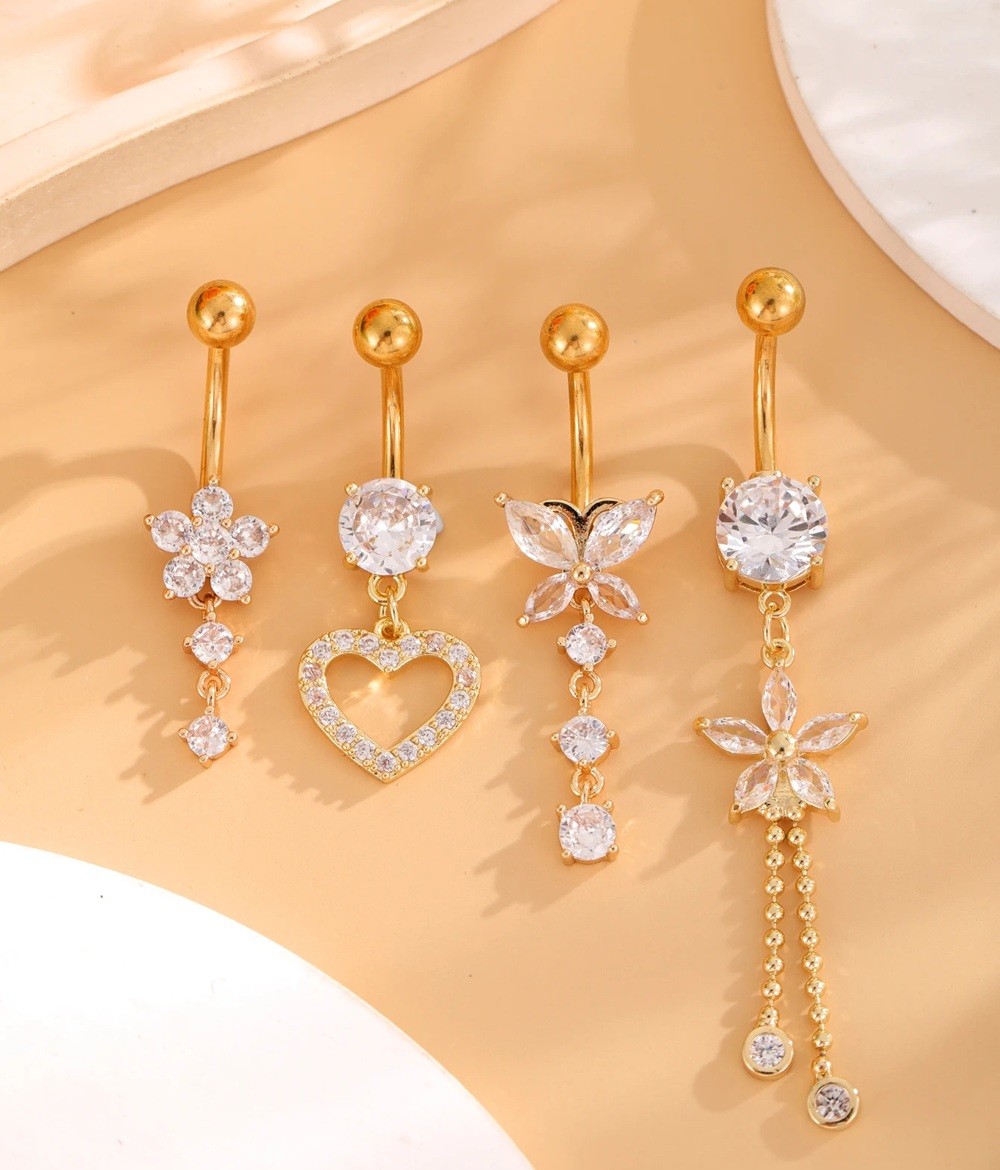 4 st Piercingar i rostfritt stål Guldutförande Diamantmotiv hjärtan fjärilar blommor Eleganta kroppssmycken