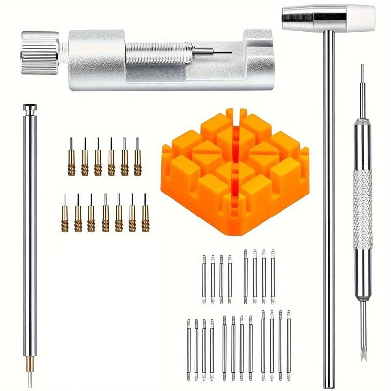 Denna 41-delars verktygssats för klockor är avsedd för enkel byte, justering och reparation av klockremmar. Tack vare kombinationen av remover, metallhammare, stabilt block, olika storlekar av stift och tillbehör erbjuder den komplett utrustning för både hem- och professionellt bruk. Satsen är lämplig för både metall- och läderremmar och möjliggör snabb justering av längd eller byte av gammal rem mot en ny. Kvalitetsmaterial säkerställer lång livslängd och exakt arbete utan risk för skada på klockan. Tack vare de kompakta måtten (block 5x5 cm, hammare 13,5 cm, remover 8,4 cm) är denna sats lätt att transportera och praktisk för daglig service.