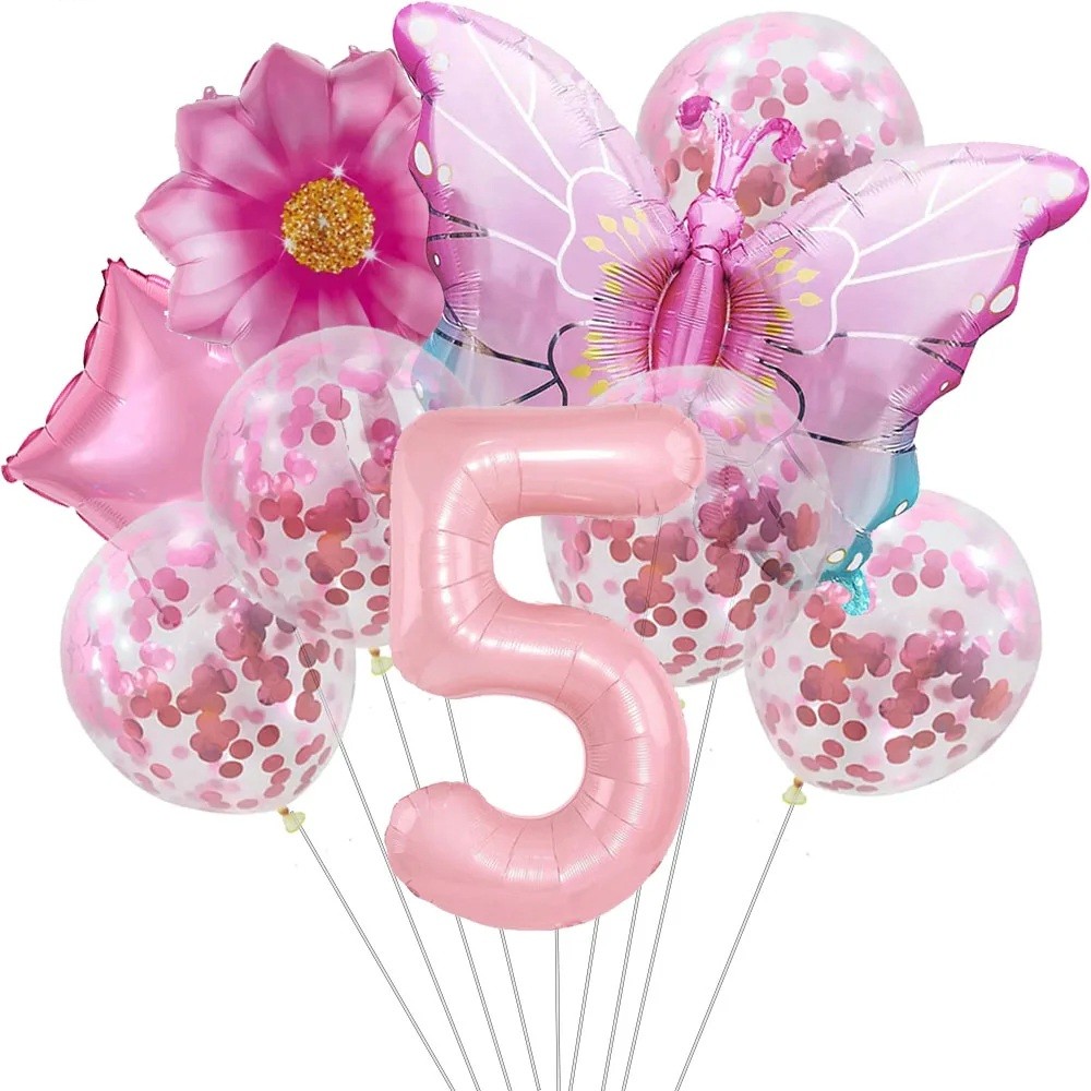 9 st Norrsken Ballonger nummer 5 Fjäril Blomma Konfetti Latexbollar och Foliebollar Festdekorationer för femte födelsedagen Barnkalas