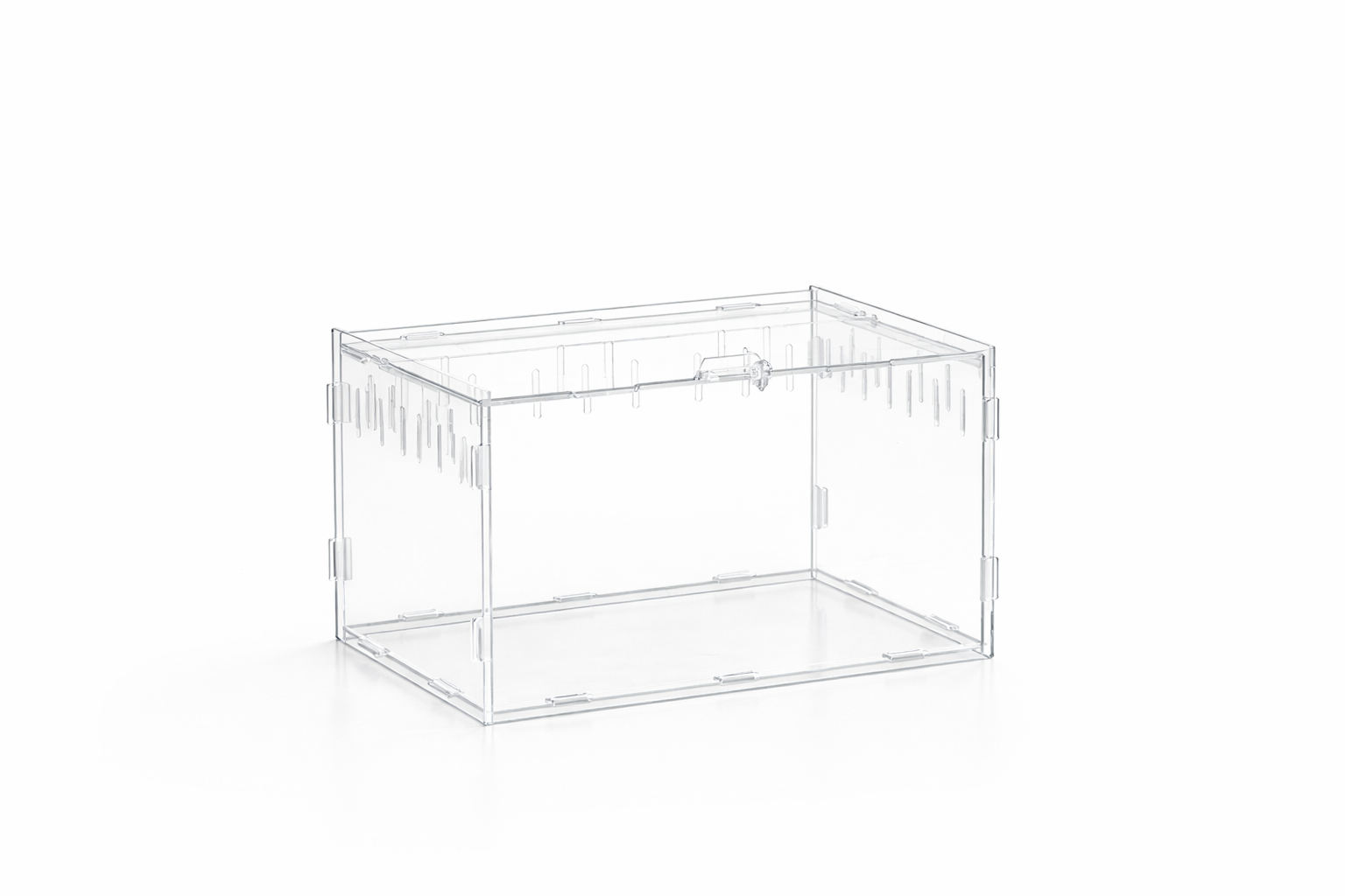 Botten är utrustad med perforerade ventilationshål som säkerställer optimal luftcirkulation, vilket förhindrar att fuktighet och temperatur blir för höga. Magnetisk stängning säkerställer säker stängning av terrariet och förhindrar att djur rymmer, vilket är idealiskt för små reptiler och insekter som kan vara benägna att rymma.