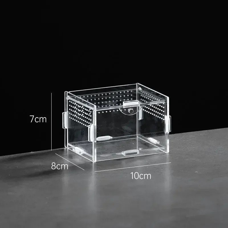 Akryllterrarium för reptiler 10 x 8 x 7 cm Mini avelsboks för tarantlar, spindlar, skorpioner och reptiler med ventilationshål akryllterrarium är idealiskt för små reptiler, tarantlar, spindlar, skorpioner och andra små terrariedjur. Tack vare sina kompakta mått 10 x 8 x 7 cm ger det tillräckligt med utrymme för rörelse och är samtidigt lätt att placera på ett bord eller i mindre utrymmen. Högtransparent akryl möjliggör enkel observation av djuren, vilket gör detta terrarium perfekt för uppfödare som vill njuta av att se sina djur i en naturlig miljö.