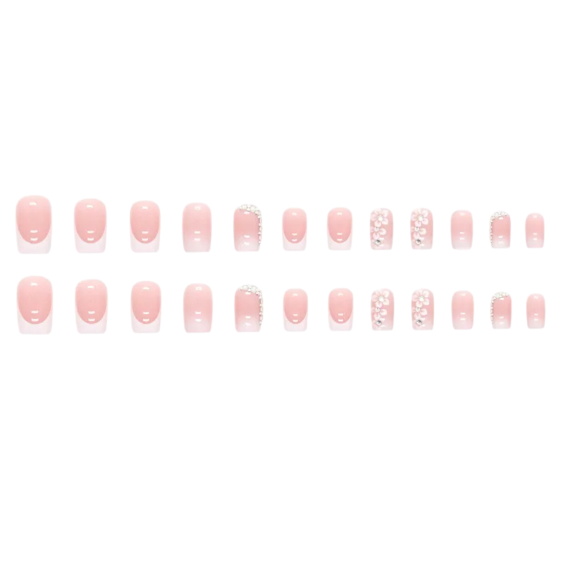 Detta set med konstnaglar är skapat för dem som vill ha en kombination av mjukhet, elegans och detaljerad dekoration i ett paket. Blommönstret ger en romantisk och ren känsla, medan ombréövergången ger manikyren ett smidigt och modernt utseende. 3D-prydnader och små stenar ger en mer framträdande accent som fortfarande är smakfull och balanserad. Medellängden är praktisk för vardagen, men ser samtidigt välvårdad och festlig ut. Därför är setet lämpligt för arbete, möten och sociala evenemang.