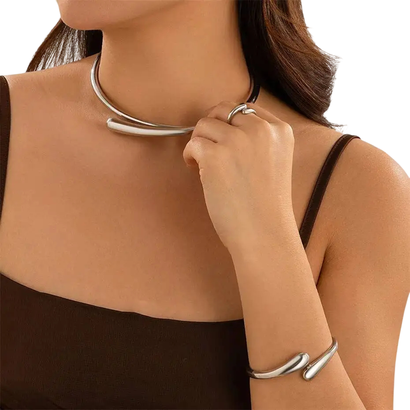 Detta avantgardesmyckeset för kvinnor förenar modern design, enkelhet och elegans i en perfekt sammansatt helhet. Setet innehåller ett halsband med en längd av 14 cm, ett armband med en diameter av 6 cm och en ring med justerbar storlek, vilket gör att den enkelt kan anpassas efter olika behov och säkerställer en bekväm användning. Den minimalistiska och trendiga looken ger en sofistikerad och tidlös känsla, vilket gör den lämplig både för festliga tillfällen och för vardagsbruk. Smyckena är tillverkade av högkvalitativ hållbar legering, som säkerställer styrka, lätthet och lång livslängd. Detta damset är det perfekta valet för bröllop, fest, jubileum och som en stilfull present.