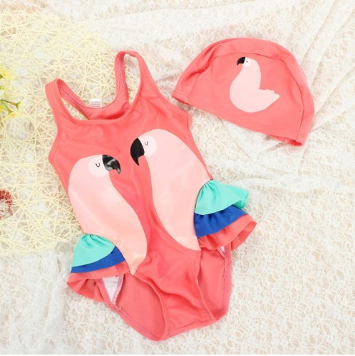 Vackert tjejset med flamingo- och svantryck, bestående av en baddräkt i ett stycke och en badmössa.