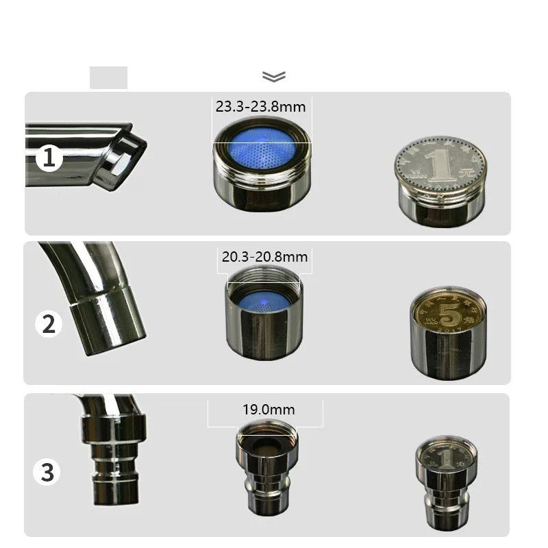 • Universella kopplingar – 3 adaptrar för kranar med diametrar 19 mm, 20,3–20,8 mm och 23,3–23,8 mm