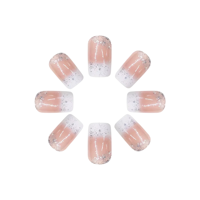 Detta set med nageltips förenar klassisk fransk manikyr med en subtil glittrande accent som ger dina händer ett modernt och fräscht utseende. Den lätt rundade fyrkantiga formen är praktisk, stilfull och optiskt balanserar nagelbädden, vilket framhäver händerna naturligt vackert. Tack vare den korta till medellånga längden är naglarna bekväma vid vardagliga aktiviteter och samtidigt tillräckligt representativa för formella situationer. Den bärbara designen är idealisk för hemmabruk – den kräver inga professionella verktyg eller erfarenhet. Varje nagel är utformad för att efterlikna formen av den naturliga nageln, vilket gör att den resulterande manikyren ser naturlig och ren ut.