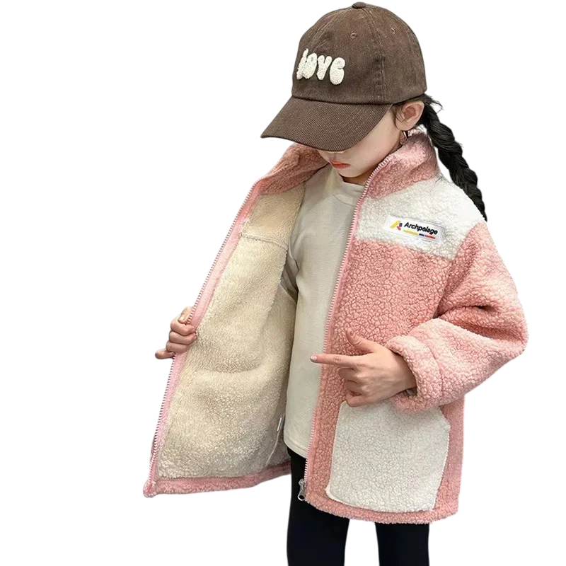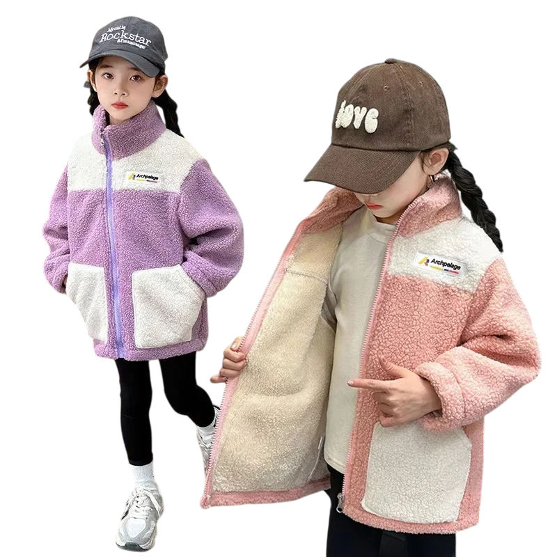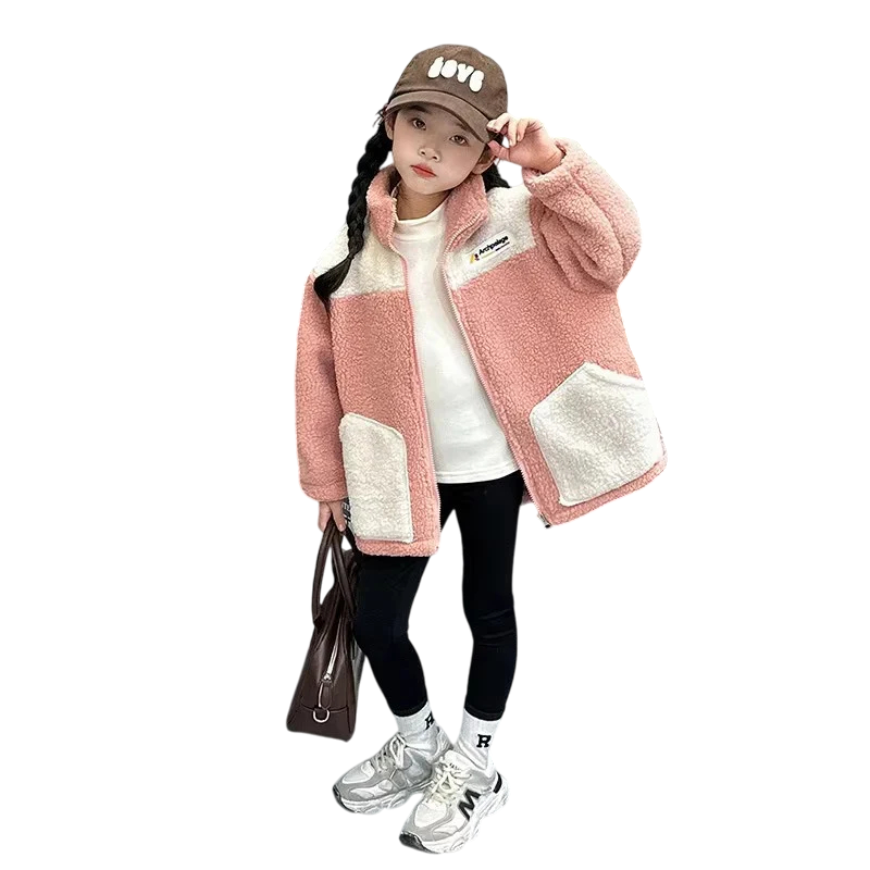 Varm flickvinterjacka med plyschfoder, hög krage, fickor och dragkedja. Bekväm att bära, lämplig för kalla dagar och vinteraktiviteter utomhus. Fullständig beskrivning
