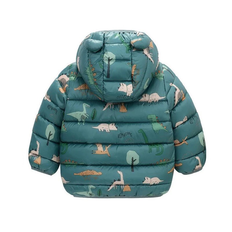 Barn vinterjacka med huva Dragkedja och knappar Varm polyesterjacka med dinosauriebilder Värmande bekväm vinterpassform