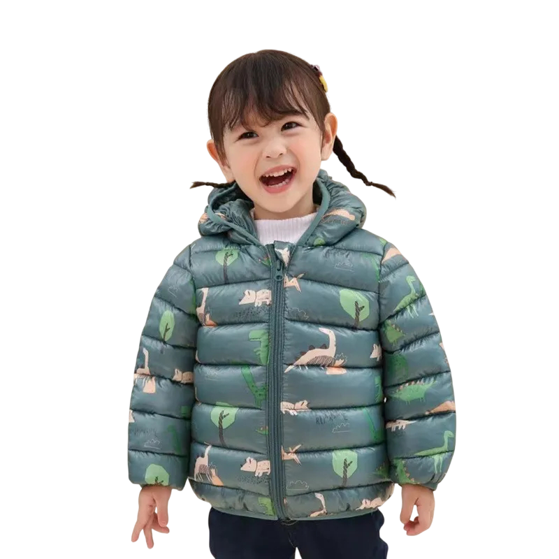 Värmande barn vinterjacka med huva, dubbel stängning och glada dinosauriebilder. Hållbar polyester skyddar mot kylan och erbjuder komfort varje dag. Fullständig beskrivning