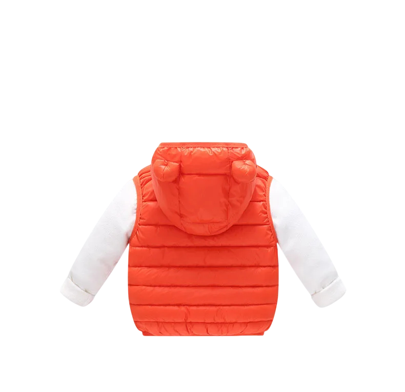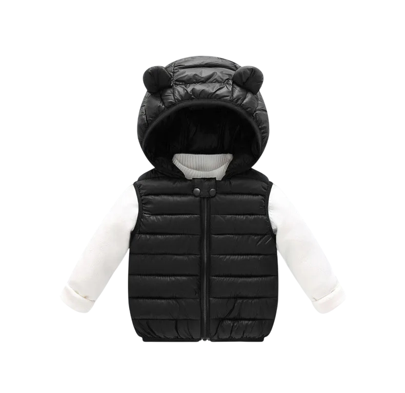 Söt barnväst med huva och öron, perfekt för kalla dagar. Varm, mjuk och bekväm – lämplig för både pojkar och flickor under höst- och vinterperioden. Fullständig beskrivning