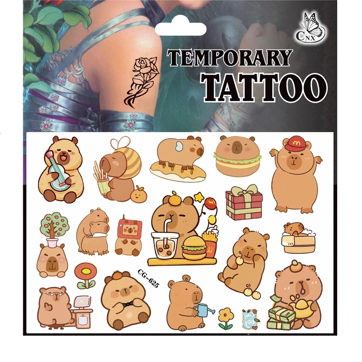 • Innehåll i förpackningen: 1 ark av barnens tillfälliga tatueringar med kapybar