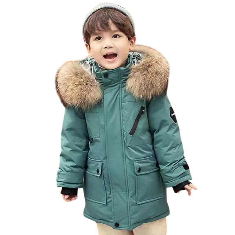 Barnens vinterjacka med dragkedja och knappar, med huva och fuskpäls, unisex, varm bomulls- och polyesterjacka för pojkar och flickor i vinterväder