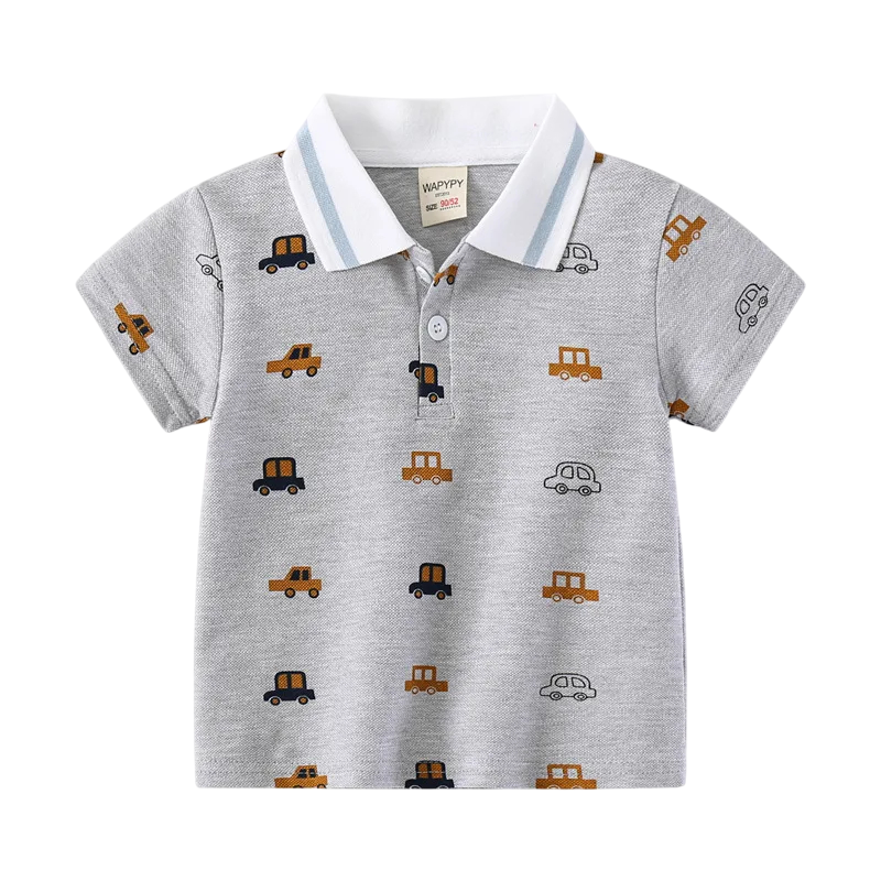 Barnpojks polo med krage och motiv av bilar Kort ärm Bomullströja med knappar till mitten