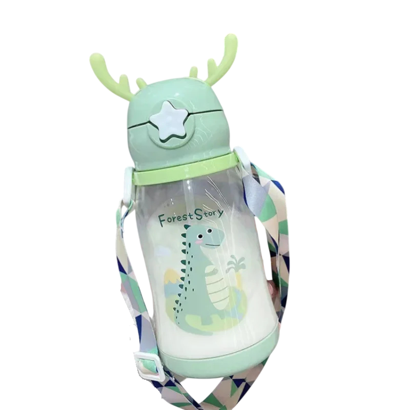 Barns plastflaska för dryck med rem och horn på locket 600 ml Plastisk bärbar vattenflaska för barn