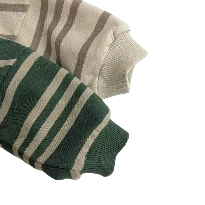 Denna tröja är den perfekta kombinationen av stil, komfort och funktionalitet, som både barn och föräldrar kommer att uppskatta. Bomull-polyesterblandningen säkerställer en optimal balans mellan mjukhet och hållbarhet. Tack vare den lösa passformen och elastiska materialet anpassar den sig efter kroppen och möjliggör obegränsad rörelse. Randig design ger tröjan ett fräscht och glatt utseende som aldrig går ur modet. Denna tröja är lätt att kombinera med byxor, leggings eller kjol, och blir en favorit i barnens garderob för alla årstider.