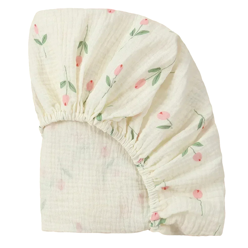 Sängkläderna är designade för att underlätta den dagliga vården av platsen där spädbarnet vilar. Bomullstyget är behagligt att ta på och hjälper till att hålla en komfortabel miljö under sömnen. Tack vare den elastiska kanten är det enkelt att sätta på och ta av sängkläderna vid byte eller tvätt. Den praktiska ovala formen är lämplig för spjälsängar, vaggar eller andra liknande typer av sängar för nyfödda. Det mjuka blommönstret ger dessutom en lugn och dekorativ känsla, så sängkläderna kan också vara en trevlig detalj i spädbarnets rum.