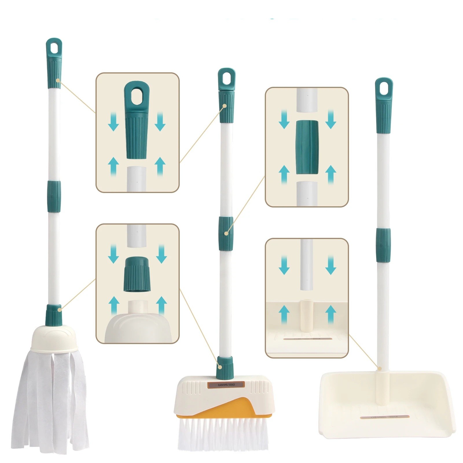 Hela setet är designat för att vara lätt att montera och demontera, vilket garanterar bekväm förvaring och transport. Långa verktyg, som mopp, kvast eller sopskyffel, har förlängda handtag med möjlighet till längdjustering. Kopplingsdelarna sätts enkelt ihop och sitter stadigt under leken. Barn kan därför anpassa verktygen och leka bekvämt utifrån sin egen höjd och möjligheter.