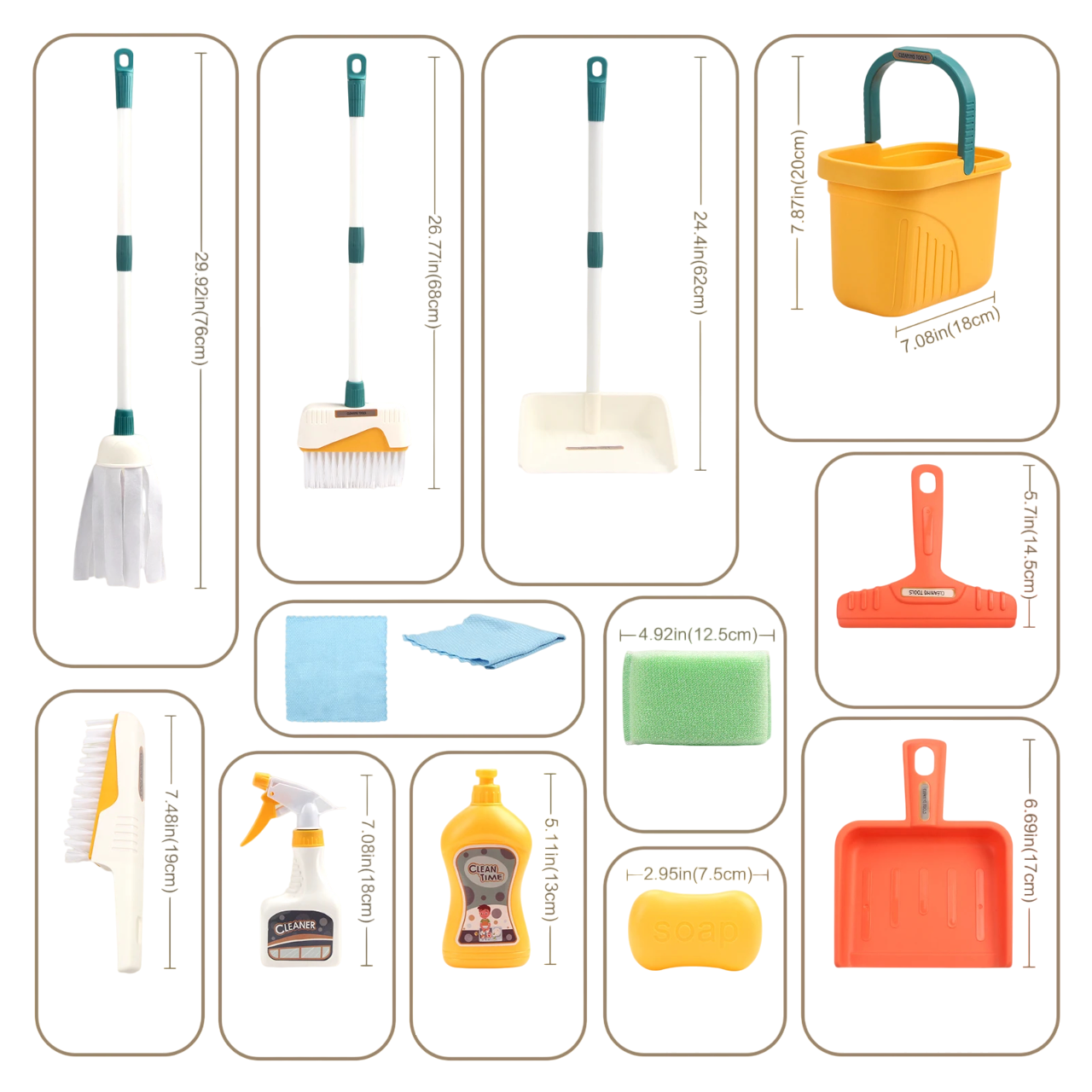 Setet innehåller en stor mopp med en längd på 76 cm, vilket gör att barn kan imitera moppning av golvet. Kvasten med mjuka borst har en längd på 68 cm och är perfekt för att leka med sopning av olika smuts. Sopskyffeln i stående version har en längd på 62 cm och kompletterar kvasten vid städning. Den andra mindre sopskyffeln med handtag har en storlek på 17 cm och är lämplig för mindre städlekar. Det saknas inte heller en skrapa (vattenskyffel) med en längd på 14,5 cm, som gör det möjligt att imitera att dra bort vatten från släta ytor.
