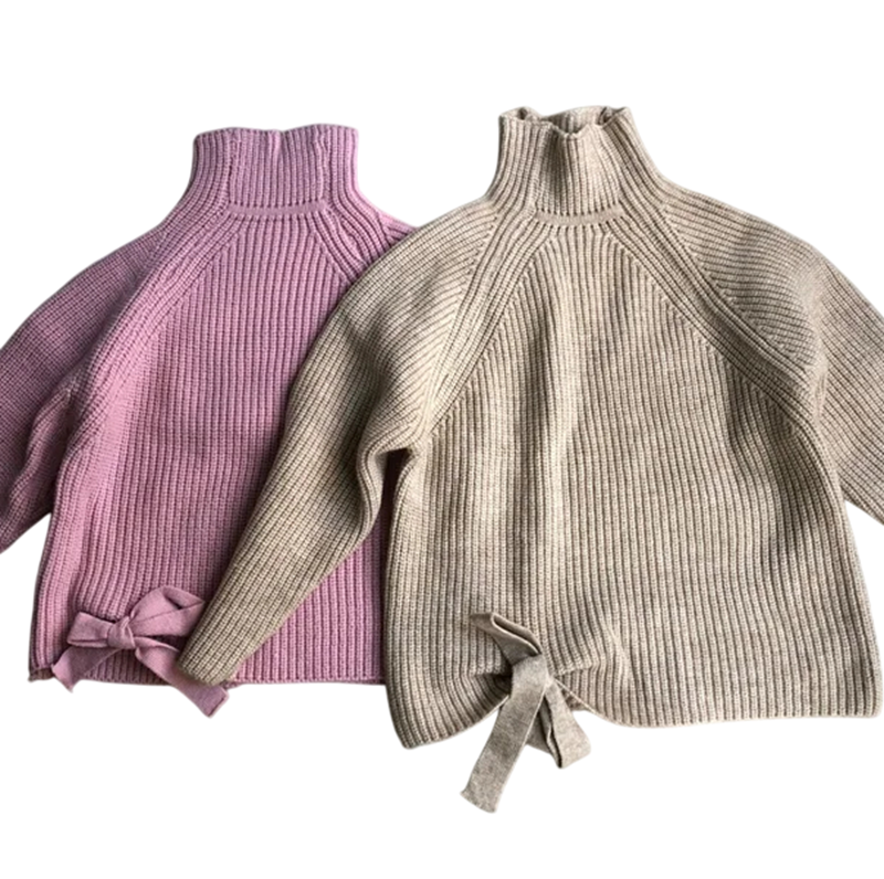 Söt barntröja med rullkrage och rosett på sidan i mjuk akryl, perfekt för vårsäsongen, för pojkar och flickor, flera färger. Fullständig beskrivning