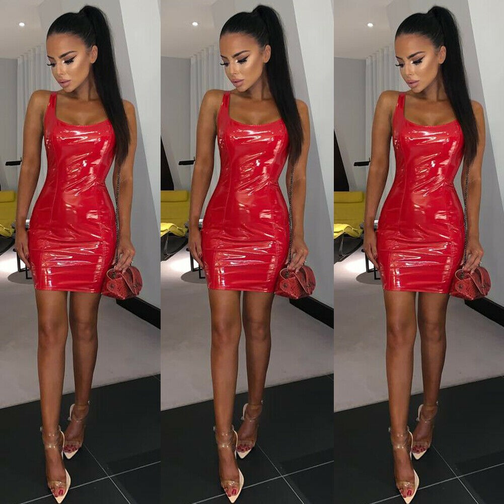 Sexig miniklänning för kvinnor gjord av glänsande konstläder.