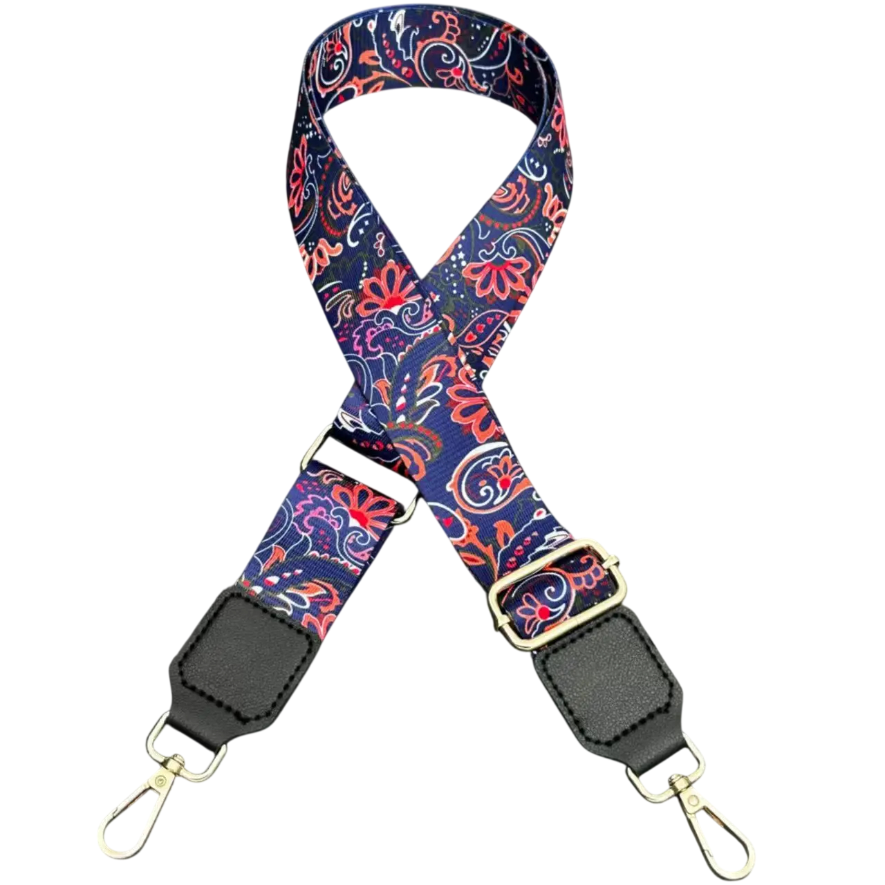 En stilren och praktisk accessoar som kan förändra utseendet på din handväska på ett ögonblick. Denna bred justerbar axelrem för handväska kombinerar modern design med hög komfort vid daglig användning. Det eleganta ornamentella blommönstret på mörkblå bakgrund ger handväskan ett originellt och tidlöst utseende.
