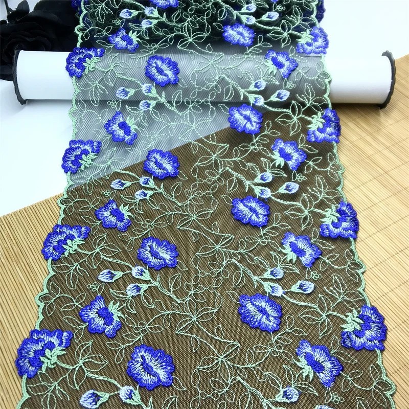Broderad spetsnät 20,5 x 91 cm Polyester spets med motiv av blå blommor Dekorativt tyg för sömnad av kläder dekorationer DIY