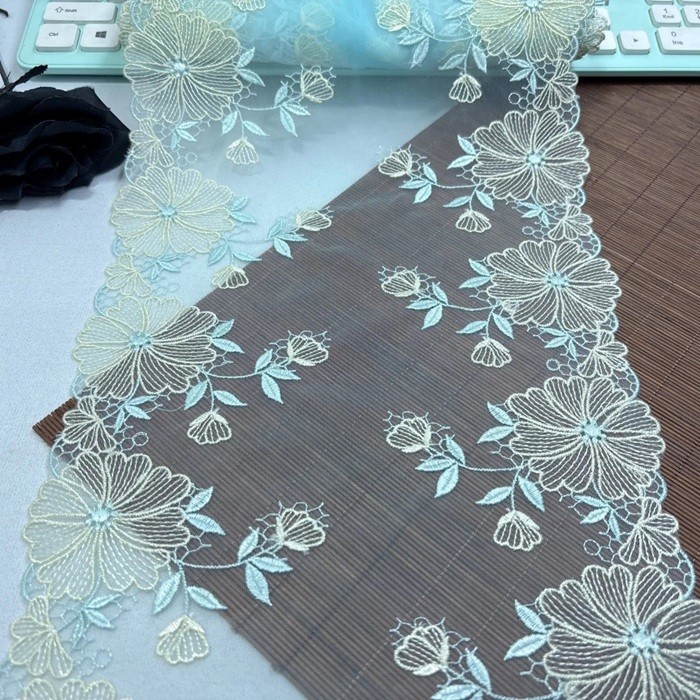 Denna dekorativa spets är idealisk för dekoration av klänningar, kjolar, kostymer eller modeaccessoarer. Den passar också utmärkt för tillverkning av bröllopsdekorationer, heminredning eller olika DIY-projekt. Broderat spetsnät med blommotiv ger varje produkt en elegant och subtil detalj.
