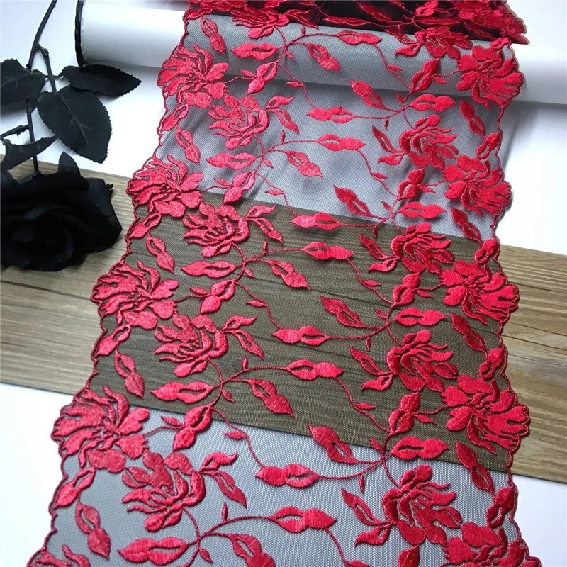 Broderad spetsnät 22 x 91 cm Röd polyester spets med växtmotiv Dekorativt tyg för sömnad av kläder dekorationer bröllop DIY