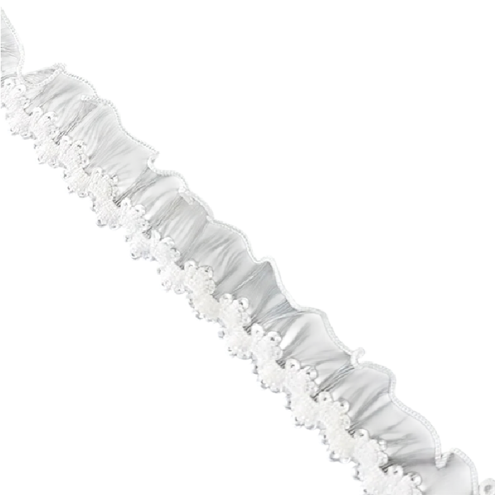 Materialet är tillverkat av nylon, som är lätt, elastiskt och anpassar sig väl till olika former. Detta gör att bandet enkelt kan sys, broderas eller på annat sätt fästas på textil. Volangstrukturen skapar en intressant plastisk effekt som ger produkterna en fin dekorativ detalj.