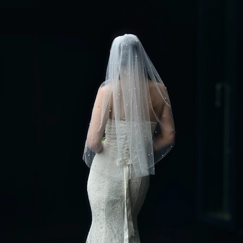 Detta vita bröllopsvoile med en längd av 75 cm (Elbow stil) är det perfekta valet för brudar som föredrar en kortare och elegant design. Den fina enskiktade tylen känns lätt och luftig, vackert faller över axlarna och känns inte tungt ens vid en hel dags användning. Voilen är dekorerad med diskreta fina pärlor som skapar en lyxig men ändå mycket subtil effekt. Kanten är avslutad med en ren skärning utan spets, vilket understryker det moderna och minimalistiska utseendet. Den praktiska metallkammen säkerställer ett fast och säkert fäste i frisyren.