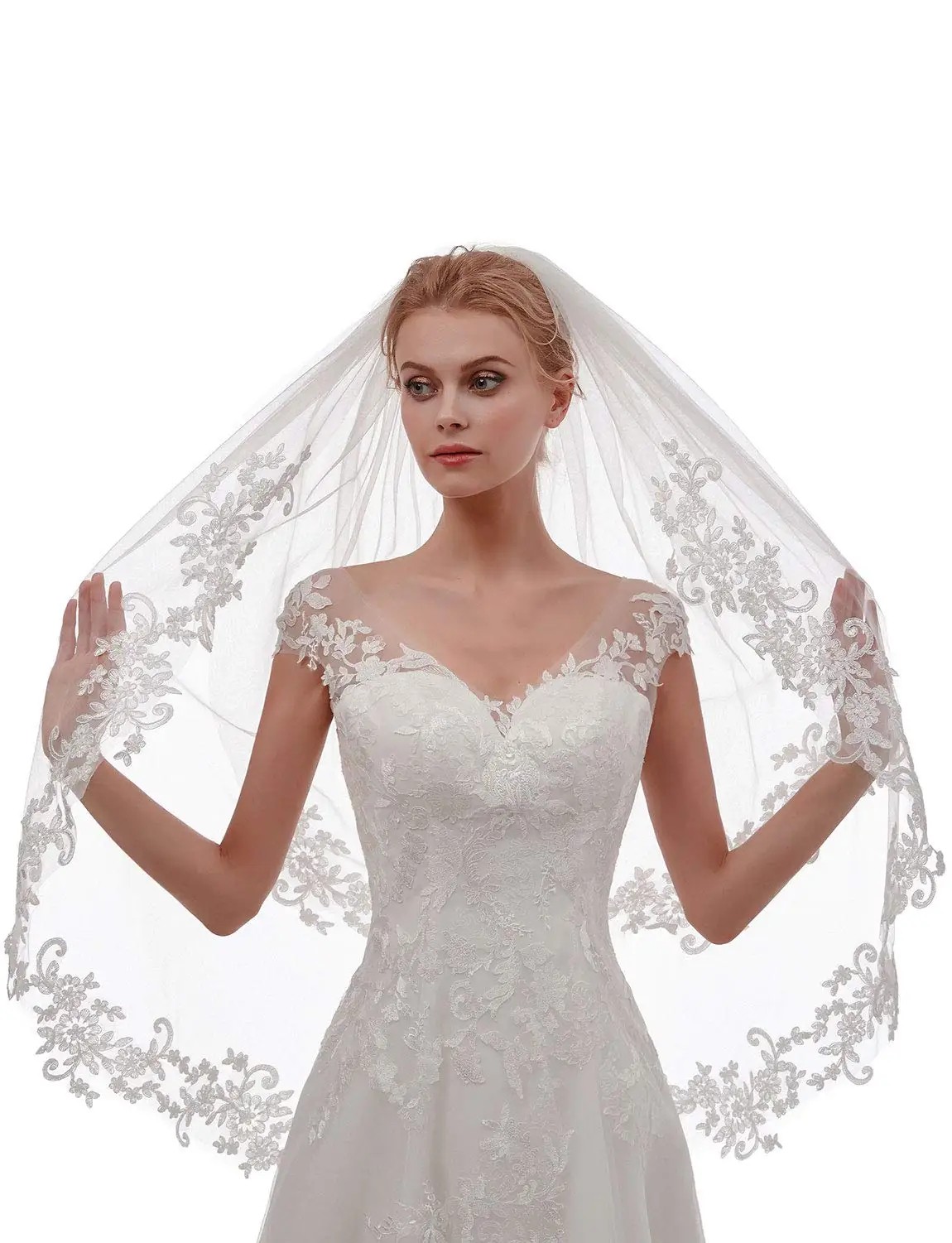 Brudslöja Kort Dubbelskiktad Tyll Med Metallkamm Spetskant Elegantisk Slöja För Bruden