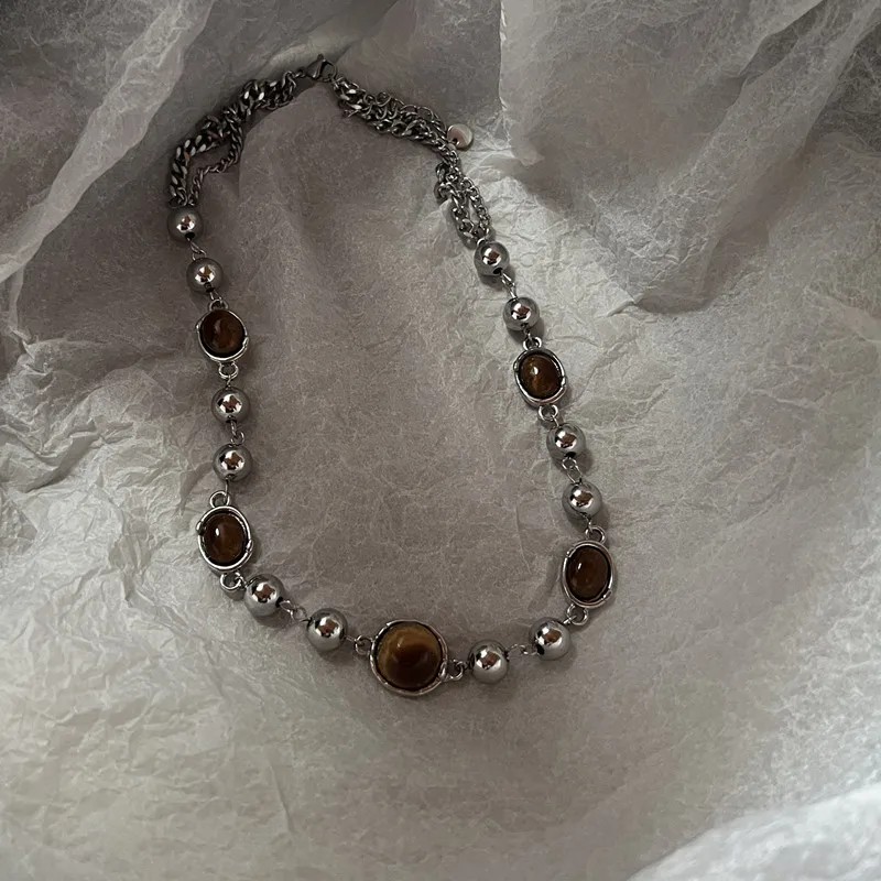 Stilfull choker i kirurgiskt stål med bruna pärlor i naturlig retro stil och justerbar längd för bekväm användning. Fullständig beskrivning