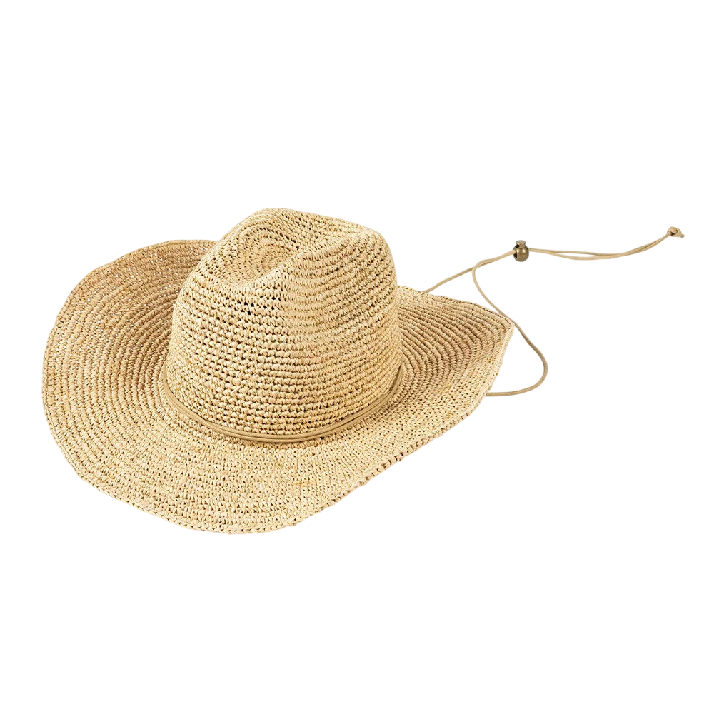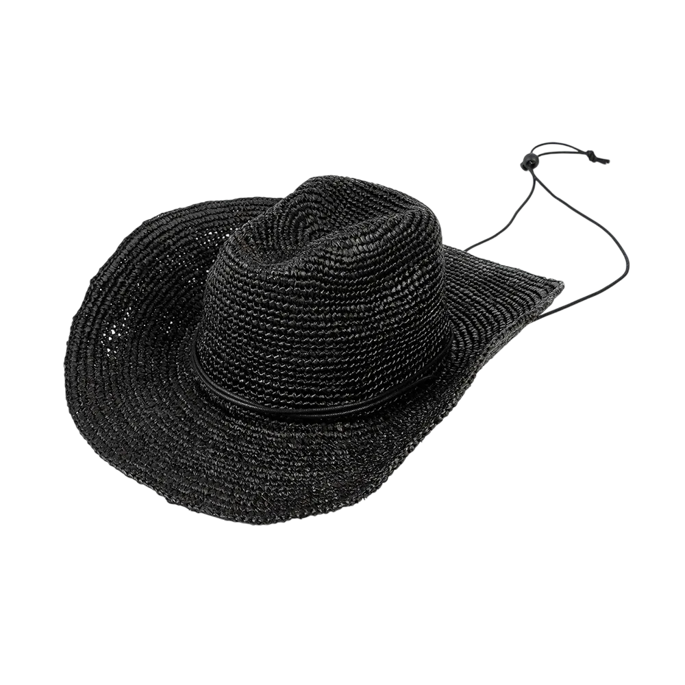 Lätt raffiahatt med snöre erbjuder stabilitet i vinden, komfort vid användning och en stilren look för sommaren och festivaler. Fullständig beskrivning