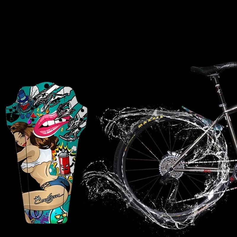 Designen av stänkskyddet är iögonfallande och färgglad, med ett seriemotiv. Motivet visar en stiliserad kvinna, framträdande läppar, skalle och andra element i graffiti- och gatukonststil. Detta utseende är perfekt för cyklister som vill att deras cykel ska se unik ut och sticka ut från vanliga enfärgade tillbehör. Motivet är väl synligt och ser dynamiskt ut även på avstånd.