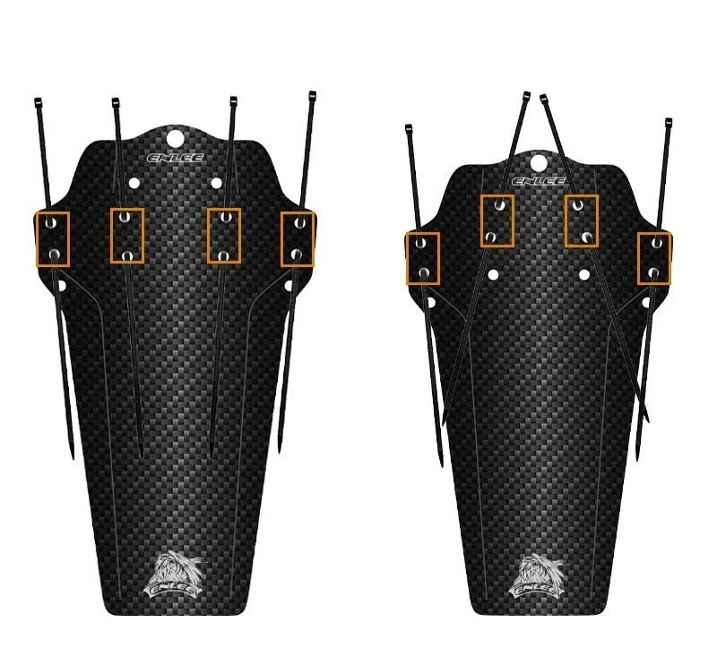 Installationsanvisning: Placera stänkskyddet mot ramen, sadelröret eller gaffeln på cykeln. Trä igenom spännbanden genom hålen i stänkskyddet och runt cykelramen. Justera stänkskyddet till önskad position och dra åt banden ordentligt. Klipp bort överflödiga ändar av banden. Rekommenderat avstånd mellan däcket och stänkskyddet är minst 1,5 cm för att undvika kontakt under cykling.