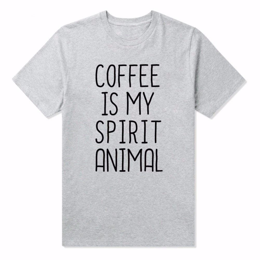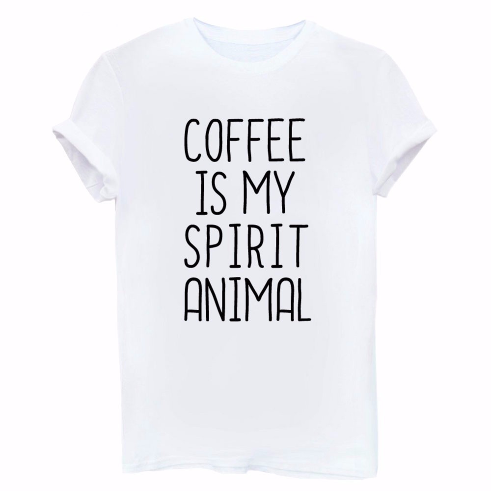 En vacker T-shirt för kvinnor med trycket COFEE IS MY SPIRIT ANIMAL kommer att vara en fantastisk present till alla kaffeälskare.