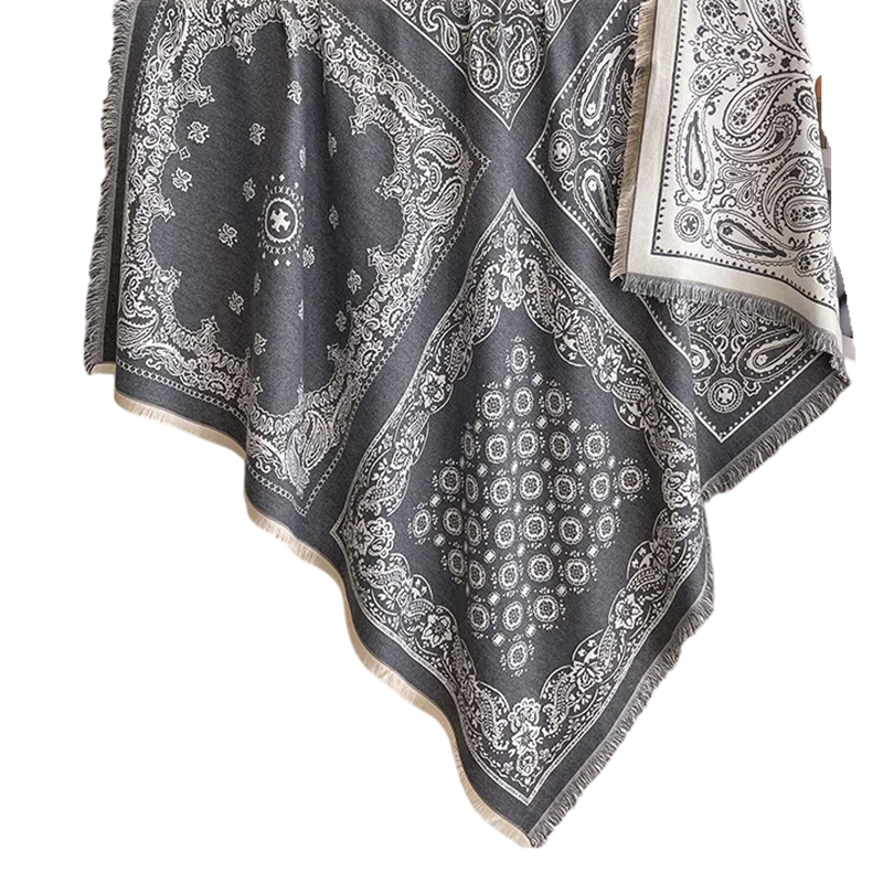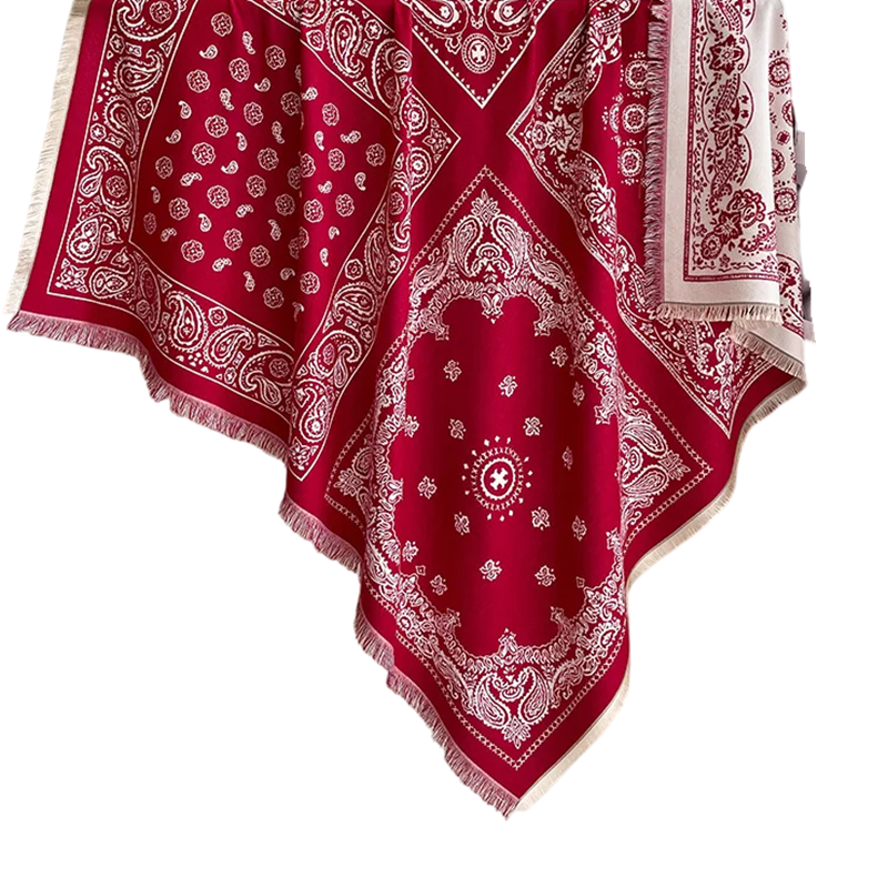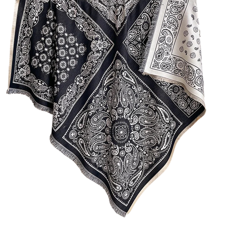 Damaskal polyesterhalsduk 130 × 130 cm med enkel mönstring och fransar. Lätt, behaglig och mångsidig, lämplig för året runt användning och lätt att kombinera. Fullständig beskrivning
