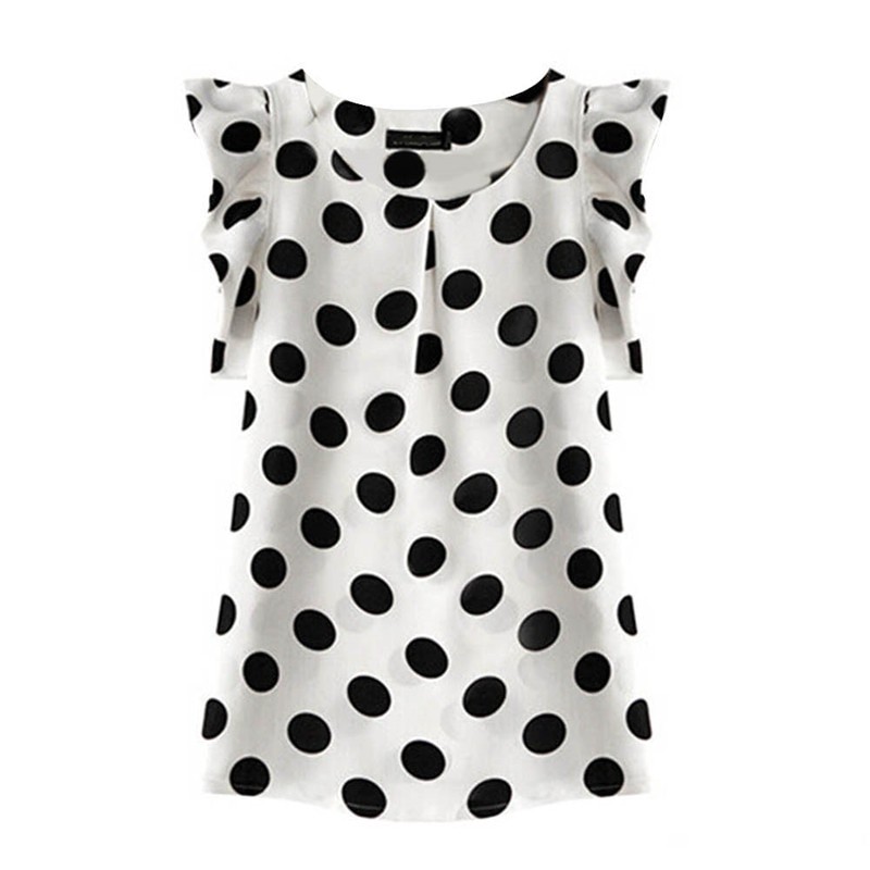 Vacker blus med prickar. Den har korta ärmar med volanger.