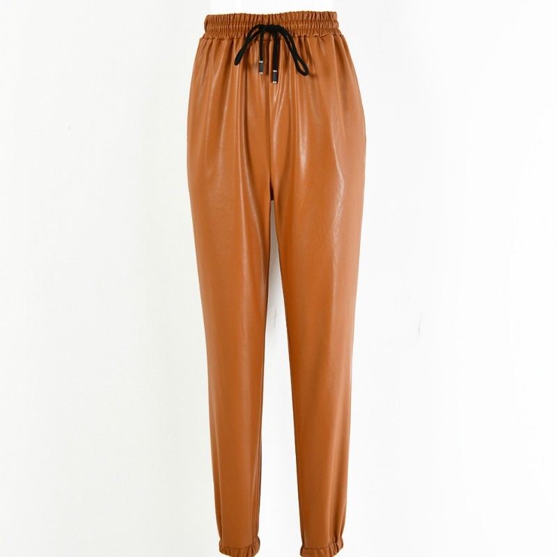 Startsida Startsida Kläder och accessoarer Damkläder Dambyxor Dambyxor med elastiskt midjeband av konstläder