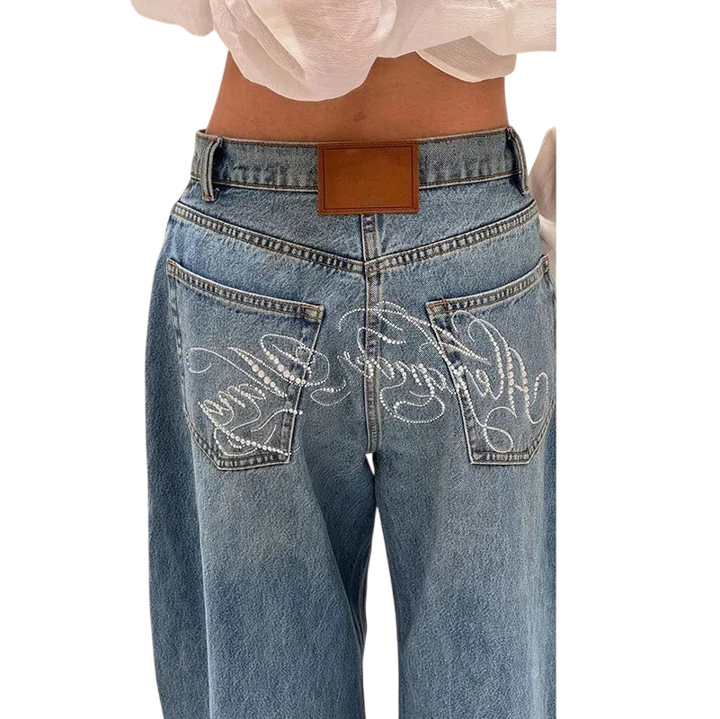 Damjeans blå Tryck på baksidan Löst snitt Fickor Bomull Polyester Bekväma avslappnade byxor Modern streetstil
