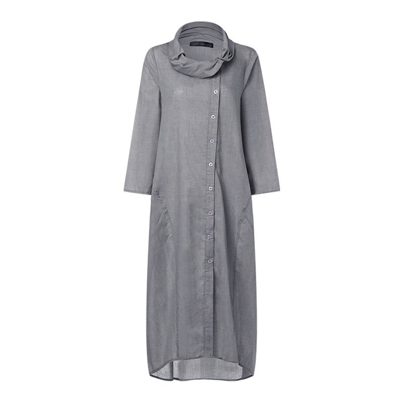 Klänningen har en turtleneck och är dekorerad med knappar.
