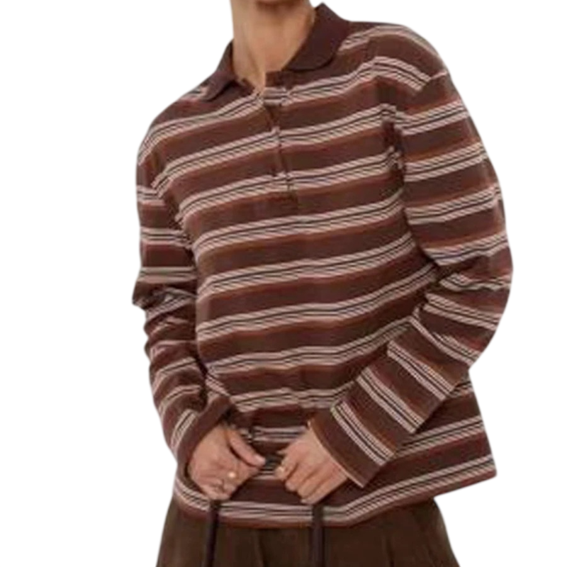 Dampolotröja med lång ärm Randig design V-ringning med krage och knappar Bomull med spandex