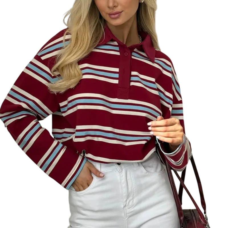 Denna dampolotröja med lång ärm är designad för kvinnor som vill kombinera komforten av naturligt material med en modern look. Kombinationen av bomull med spandex säkerställer en behaglig känsla mot kroppen, god andningsförmåga och samtidigt mjuk flexibilitet för rörelsefrihet. Den randiga designen ger modellen en tidlös karaktär som aldrig går ur mode. V-ringningen tillsammans med kragen och knapparna skapar en elegant polo-stil som är lämplig för vardagsbruk. Den långa ärmen ger komfort även under kallare dagar.